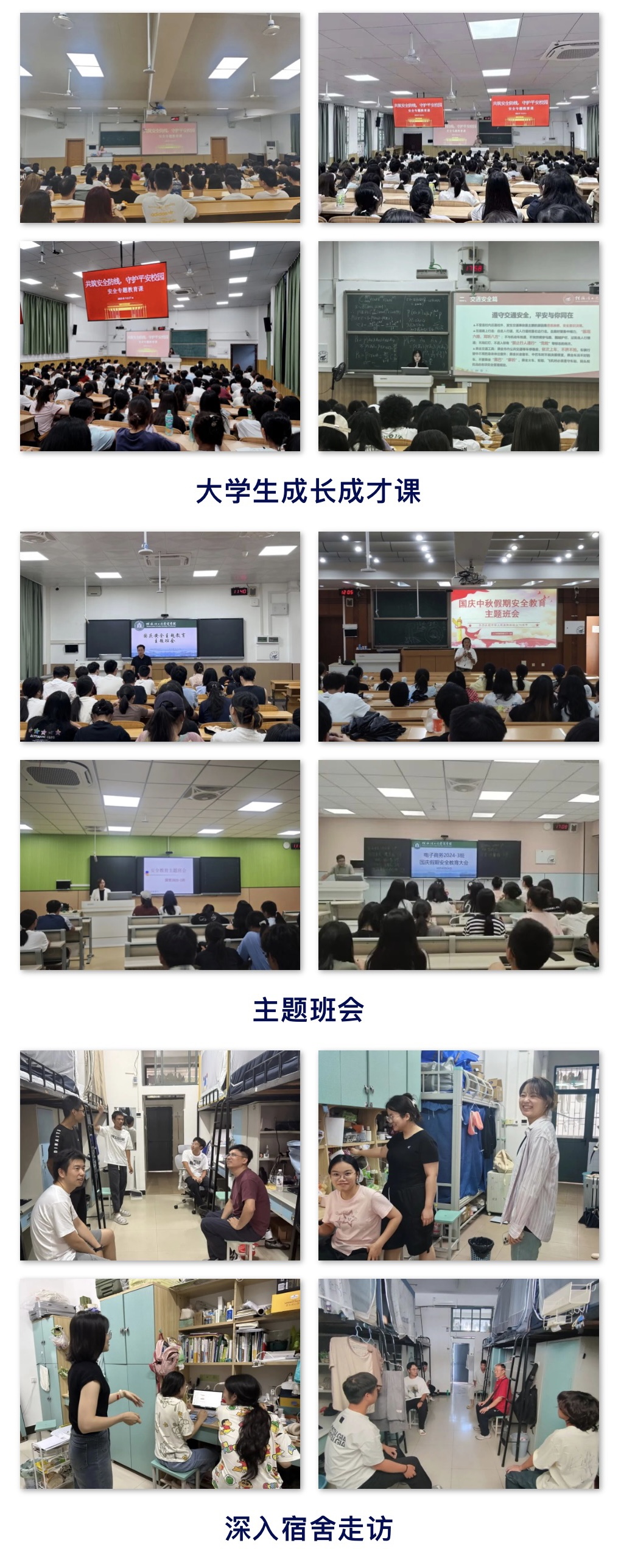 為切實(shí)做好國慶、中秋假期安全穩(wěn)定工作,進(jìn)一步增強(qiáng)學(xué)生安全防范意識(shí),營造安全、文明、和諧的校園環(huán)境,學(xué)院于9月25日—30日,通過多種形式開展安全主題教育,為學(xué)生的假期安全保駕護(hù)航。學(xué)院以大學(xué)生成長成才課、主題班會(huì)為陣地,重點(diǎn)從假期學(xué)生管理規(guī)定、人身安全、交通安全、財(cái)產(chǎn)安全、出行安全、網(wǎng)絡(luò)安全、宿舍安全、飲食安全、防火防盜、電信詐騙、防溺水等方面進(jìn)行教育,切實(shí)增強(qiáng)學(xué)生安全防范意識(shí)。輔導(dǎo)員、班主任深入宿...