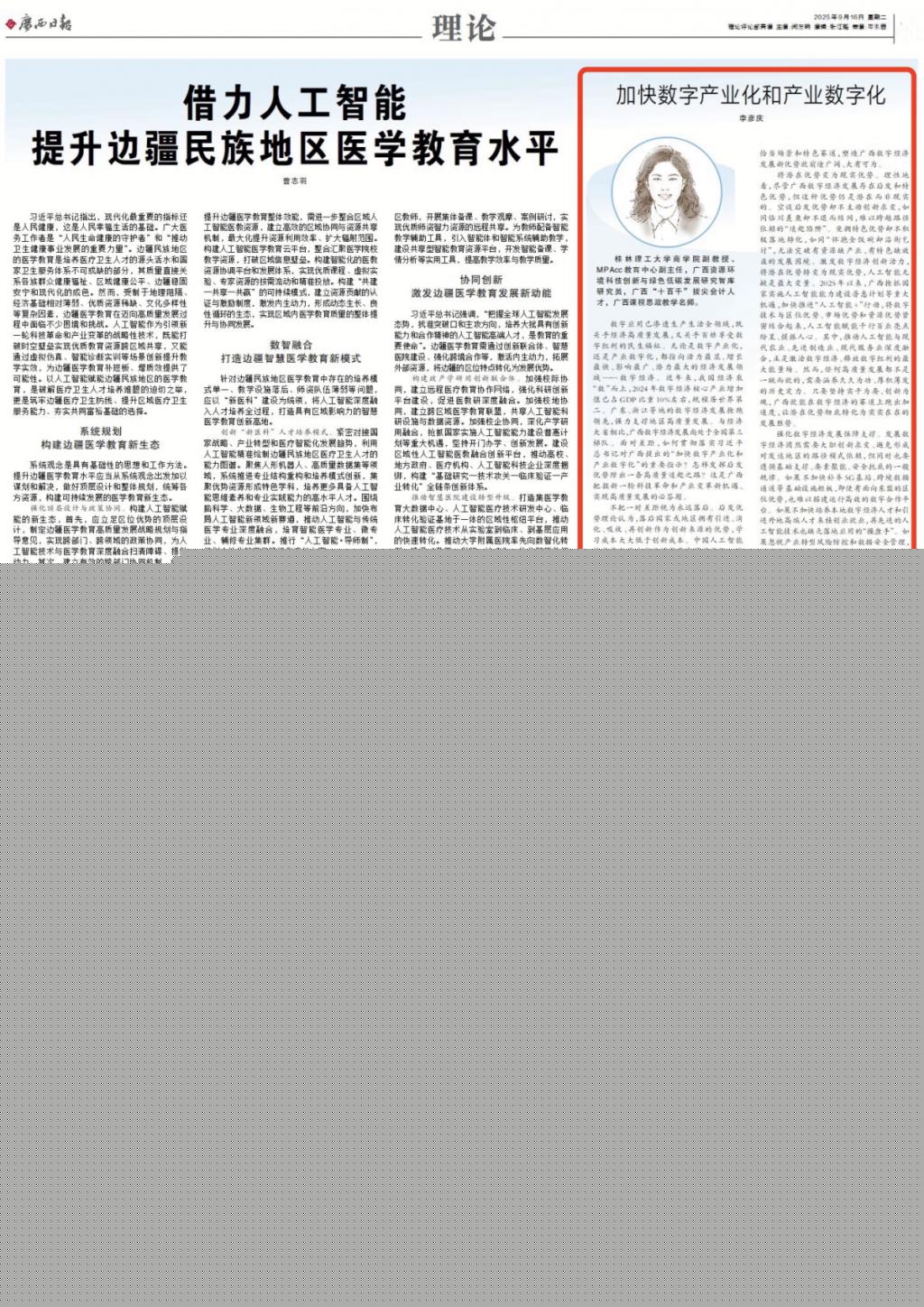 近日,《廣西日報(bào)》“青年說理”欄目刊發(fā)中國·永樂高131net李彥慶副教授理論文章《加快數(shù)字產(chǎn)業(yè)化和產(chǎn)業(yè)數(shù)字化》。文章從“不把一時(shí)差距視為永遠(yuǎn)落后”、“將潛在優(yōu)勢變?yōu)楝F(xiàn)實(shí)優(yōu)勢”、“強(qiáng)化數(shù)字經(jīng)濟(jì)發(fā)展保障支撐”等三個(gè)方面進(jìn)行了介紹。現(xiàn)將全文轉(zhuǎn)載如下。外宣稿鏈接:https://apph5.cloudgx.cn/article/sync1967727903722569728李彥慶:桂林理工大學(xué)商學(xué)院副教授、MPAcc教育中心副主任,廣西資源環(huán)境科技創(chuàng)新與綠色低碳發(fā)展研究智庫研究員...